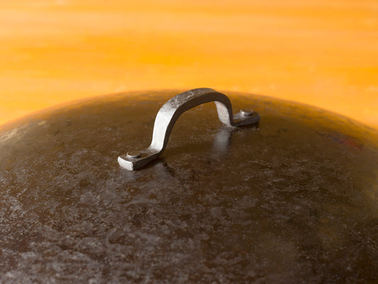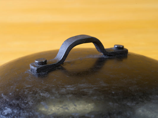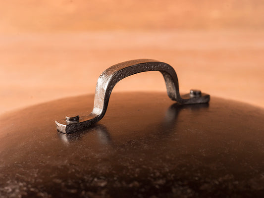 一枚板から継ぎ目なく絞り技法で成形された蓋には、熱間鍛造で打ち出した取っ手が、一般的なネジでは無く、これまた手作りの耐久性のあるリベットでしっかりと取付けてあります。仮に変形しても穴さえ開いていなければ元に戻すことができます。キャンプやバーベキューなどハードな使用条件にも最適です。